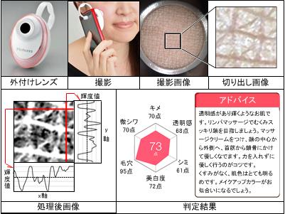 従来、専門知識と高価な撮影装置を必要としましたが、安価な小型カメラで撮影した肌画像をサーバー側に送るだけで、詳細な肌分析結果とそれに対する専門家のアドバイスが得られます。